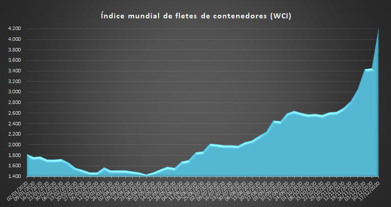 Por su parte, El World Container Index (WCI), que evalúa el coste de los fletes en la principales rutas hacia y desde Estados Unidos, se sitúa esta semana en $ 4.244,05 para un contenedor de 40 pies, lo que supone un aumento del 23% con respecto a la semana anterior y del 166,6% en comparación con el mismo período de 2019. El índice compuesto promedio del WCI, evaluado por Drewry para el año hasta la fecha, es de $ 2.087 por contenedor de 40 pies, $ 560 más alto que el promedio de los últimos cinco años, situado en $ 1.527 por contenedor de 40 pies.