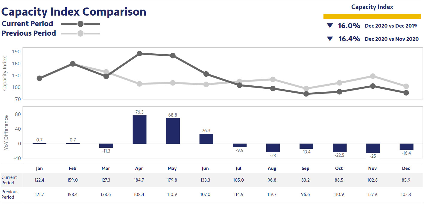 - La capacidad de transporte disponible ha sido, un 16,0% más baja en diciembre de 2020 que en diciembre de 2019.
