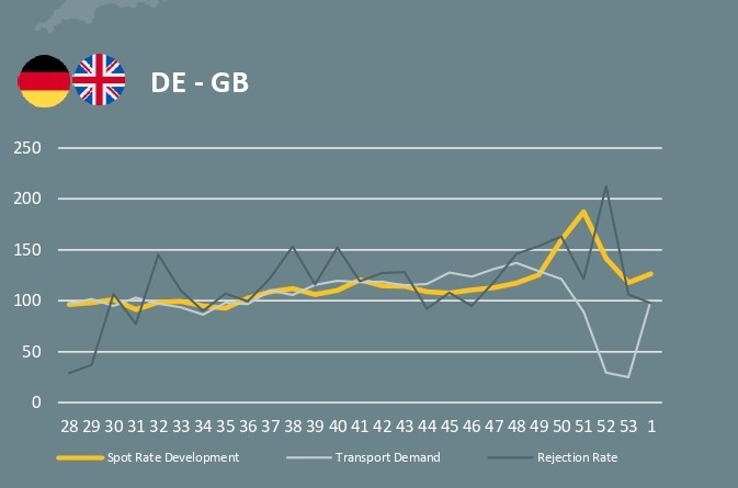 Un fuerte rebote de la demanda de Alemania a Gran Bretaña. Está ahora en el nivel medio del tercer trimestre, lo que no es típico del primer trimestre. Parece que el transporte se está moviendo pero a un nivel de precios más alto – los rechazos de transporte contratado fueron inferiores al promedio del tercer trimestre, pero las tasas al contado siguen siendo significativamente más altas.
