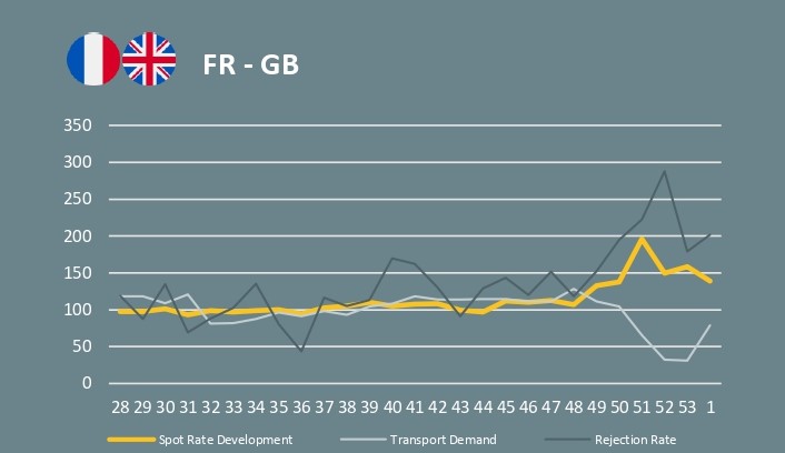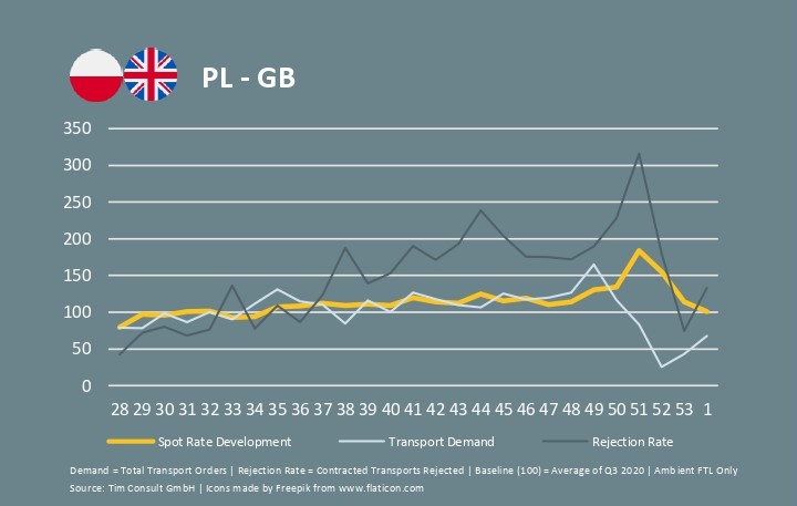 Un fuerte rebote de la demanda de Alemania a Gran Bretaña. Está ahora en el nivel medio del tercer trimestre, lo que no es típico del primer trimestre. Parece que el transporte se está moviendo pero a un nivel de precios más alto – los rechazos de transporte contratado fueron inferiores al promedio del tercer trimestre, pero las tasas al contado siguen siendo significativamente más altas.