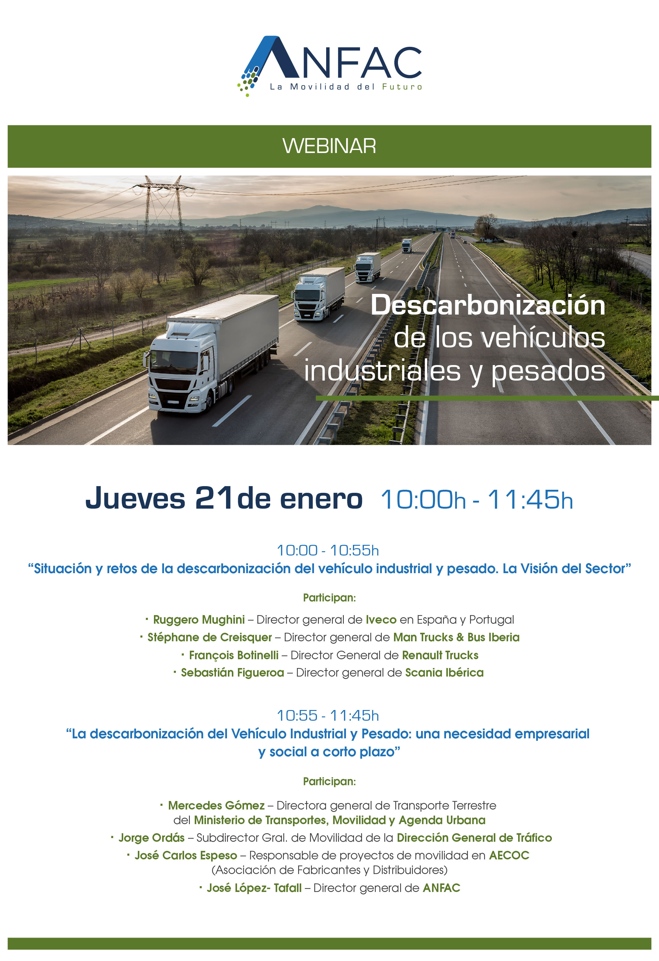 Es por ello, que el próximo 21 de enero a las 10,00 h ANFAC celebra un webinar sobre “La descarbonización del vehículo industrial y el transporte pesado”. Este webinar servirá para poner sobre la mesa la hoja de ruta y las principales tendencias que definirán el futuro de los vehículos industriales y pesados.
