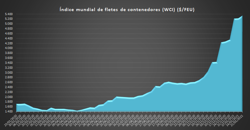Por su parte, El World Container Index (WCI), que evalúa el coste de los fletes en la principales rutas hacia y desde Estados Unidos, se sitúa en 5.340,30 dólares por contenedor de 40 pies, lo que supone un aumento del 1,96% con respecto a la semana anterior y del más del 209% en comparación con el mismo período de 2020.