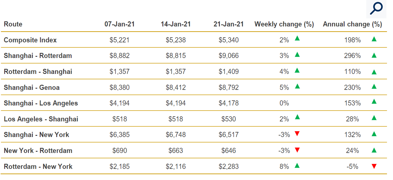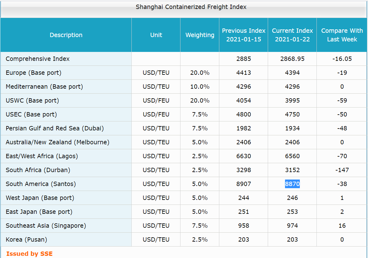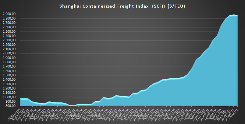 El coste de traer un contenedor desde Shanghái, según contempla el Shanghái Containerized Freight Index (SCFI), ha sufrido un aumento del 192% respecto al mismo periodo de 2020 (-0,56% en relación a la semana anterior), colocándose en 2.868,95 $/TEU.