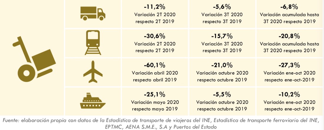 De otra parte, también se analizan los distintos modos y segmentos de transporte donde se puede observar también importantes descensos. Claramente el segmento de viajeros es el más afectado. Dentro de este, los modos que han recibido un mayor impacto son aquellos que tienen una mayor componente internacional (aéreo y marítimo) debido a los cambios en los patrones de movilidad y a la necesidad de realizar cuarentenas en muchos países. De otra parte, en el segmento de mercancías se observa un mejor comportamiento de la carretera y del transporte marítimo, en comparación con otros modos.
