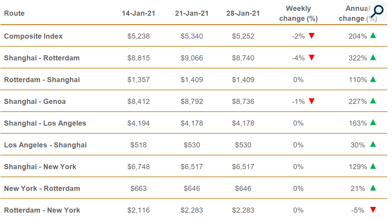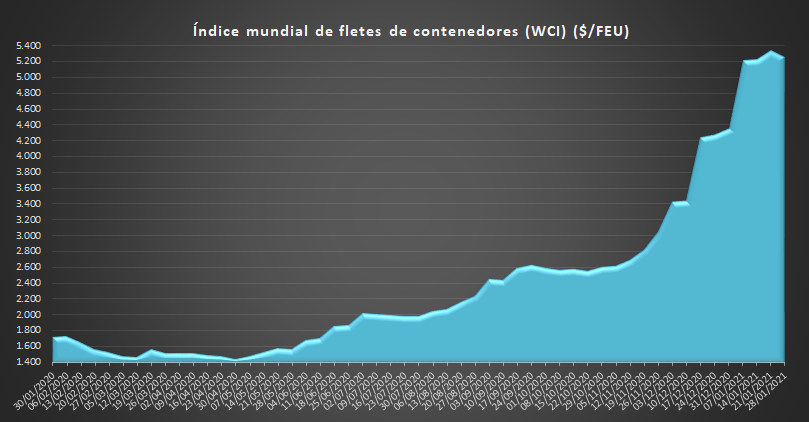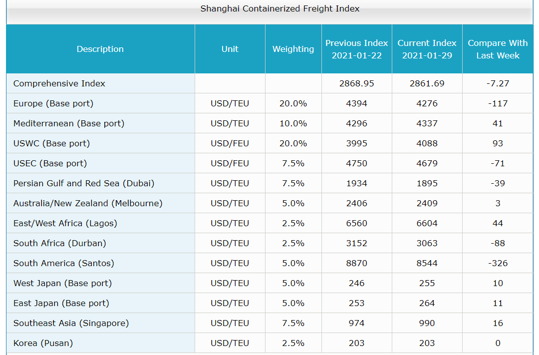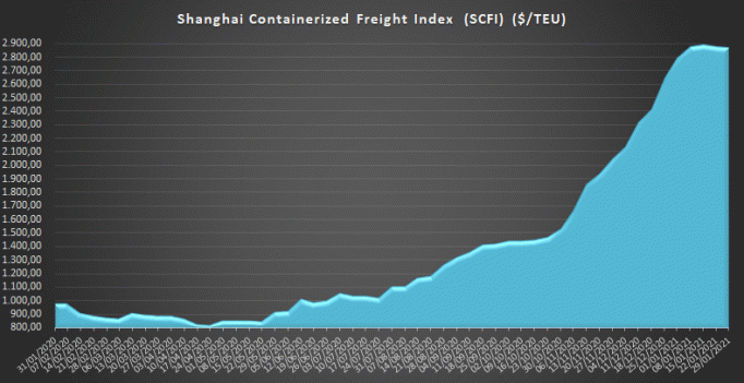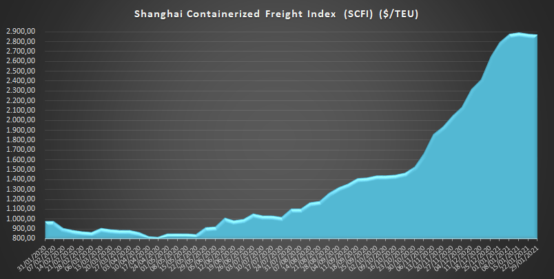 El coste de traer un contenedor desde Shanghái, según contempla el Shanghái Containerized Freight Index (SCFI), ha sufrido un aumento del 192% respecto al mismo periodo de 2020 (-0,25% en relación a la semana anterior), colocándose en 2.861,69 $/TEU.