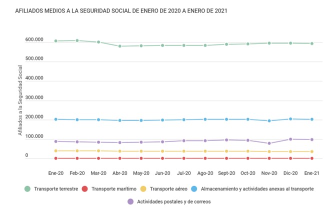 En el régimen general, la seguridad social ha contabilizado un total de 715.111 afiliados logísticos, lo que supone una caída del 1,2% respecto a noviembre y un descenso del 2,5% respecto a enero del 2020, es decir, 15.685 personas afiliadas menos a la seguridad social en régimen general en el sector logístico y de transporte.