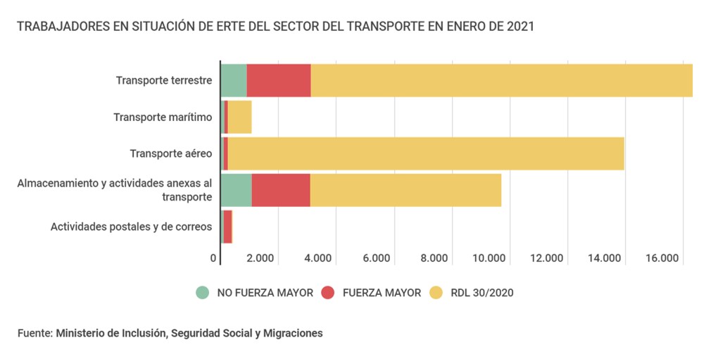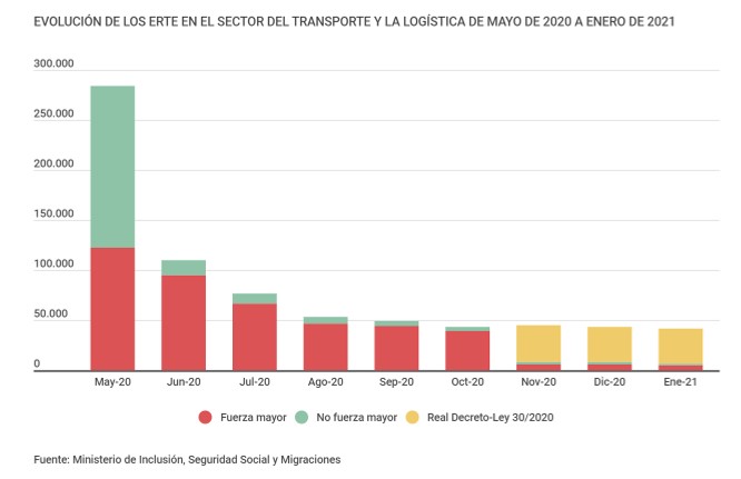 Los datos del ministerio de Inclusión, Seguridad Social y Migraciones reflejan una reducción del 5,3% en enero respecto al mes anterior en el número de trabajadores afectados por un ERTE dentro del ámbito de la logística y el transporte. El total de expedientes de regulación temporal se sitúa en 41.402, de los cuales 34.432 se han acogido al ERTE tras el Real Decreto del 30 de septiembre del año pasado, 4.732 se han mantenido en ERTE por fuerza mayor y los 2.238 restantes permanecen por no fuerza mayor. Del total de afectados en el sector logístico, 28.402 son hombres y 13.000 son mujeres, por lo que ambos han experimentado descensos.