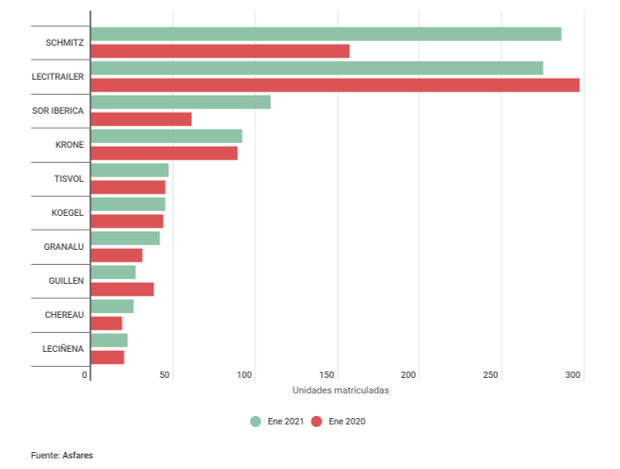 Por lo que respecta a la evolución de las principales marcas en este primer mes de 2021, Schmitz Cargobull ha desbancado a Lecitrailer de la primera posición. Este cambio de posición se ha cimentado, sobre todo, en el crecimiento del 82,2% de la marca alemana, el mayor ascenso porcentual del mercado en enero. Este aumento, unido a la contracción del 7,4% de Lecitrailer, han motivado la pérdida de liderazgo del fabricante español en el primer mes de 2021.