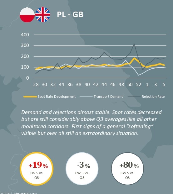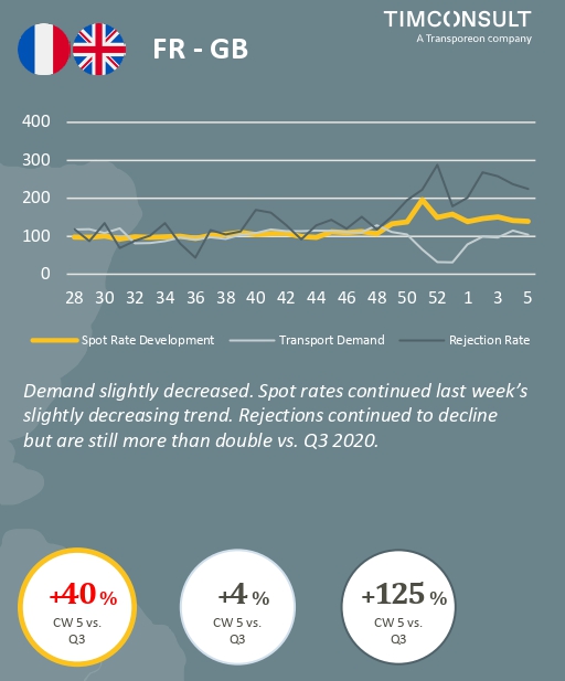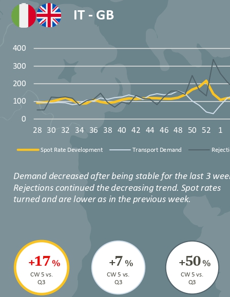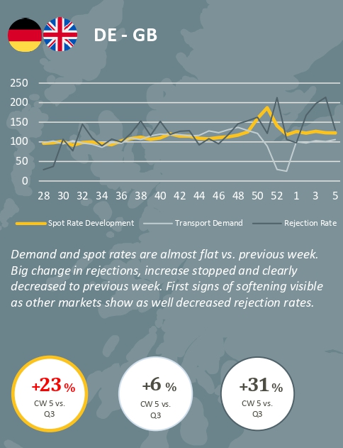 La demanda y las tarifas al contado se mantienen casi planas con respecto a la semana anterior. Gran cambio en los rechazos, aumento detenido y claramente disminución respecto a la semana anterior. Se observan los primeros signos de suavización, ya que otros mercados también muestran una disminución de las tasas de rechazo.