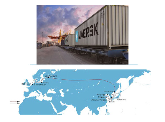 Maersk ha enviado el primer tren de contenedores cargado con mercancía japonesa, desde la estación Nakhodka-Vostochnaya, vái Ferrocarril Transiberiano, con destino Reino Unido. El tiempo total de viaje será de unos 42 días para recorrer 10.000 kilómetros por vía férrea.