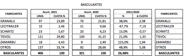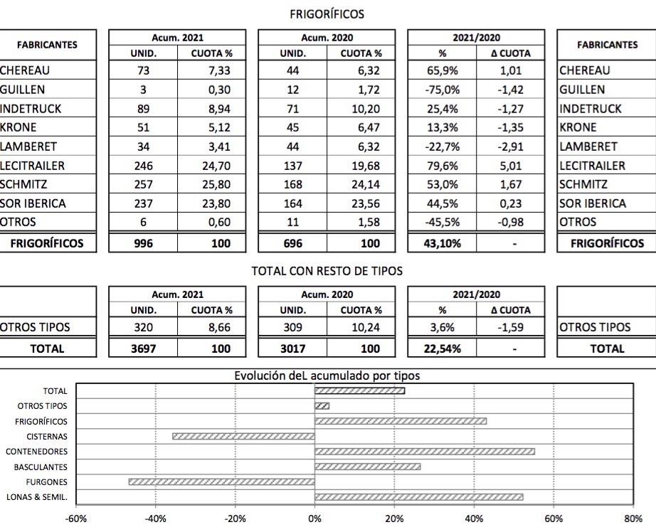 El mes de marzo ha subido un 51,07% en el acumulado de enero y mazo hay una subida del 12,40%, se ha vendido un total 1195 unidades frente a 791 en marzo del año anterior. El efecto estadístico del cierre duro por el Covid brinda unos datos espectaculares. Pero que no obstante prometen un año muy bueno. Lecitrailer le pega duro en el frigo sube un 80%.