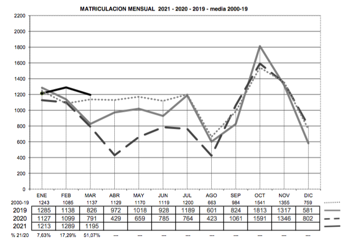 El mes de marzo ha subido un 51,07% en el acumulado de enero y mazo hay una subida del 12,40%, se ha vendido un total 1195 unidades frente a 791 en marzo del año anterior. El efecto estadístico del cierre duro por el Covid brinda unos datos espectaculares. Pero que no obstante prometen un año muy bueno. Lecitrailer le pega duro en el frigo sube un 80%.