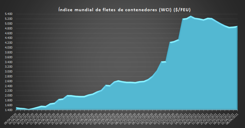 Por su parte, el World Container Index (WCI), que evalúa el coste de los fletes en la principales rutas hacia y desde Estados Unidos, se sitúa en 4.910,55 dólares por contenedor de 40 pies, lo que supone un incremento del 0,5% con respecto a la semana anterior, pero una subida del 221% en comparación con el mismo período de 2020.