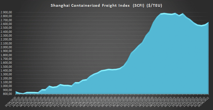 Según contempla el Shanghái Containerized Freight Index (SCFI), esta semana los fletes desde Shanghái marcan un aumento del 2,6% respecto a la semana anterior y un incremento del 206% respecto al mismo periodo de 2020, lo que coloca al índice en 2.652,12 $/TEU.