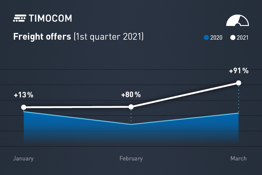 Según el barómetro de transporte de Timocom, que se calcula con las cargas registradas de 46 países europeos, el primer trimestre sobrepasó al del ejercicio previo en un 58 % en total tras un arranque tranquilo. En todo este periodo, se generaron más de 10 millones de cargas frente al mismo trimestre de 2020.