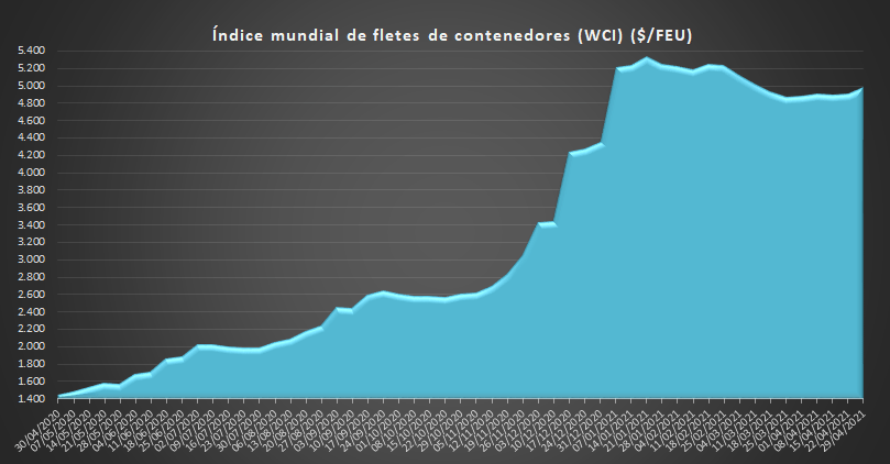 Por su parte, el World Container Index (WCI), que evalúa el coste de los fletes en la principales rutas hacia y desde Estados Unidos, se sitúa en 4.983,74 dólares por contenedor de 40 pies, lo que supone un incremento del 1,4% con respecto a la semana anterior y una subida del 245% en comparación con el mismo período de 2020.