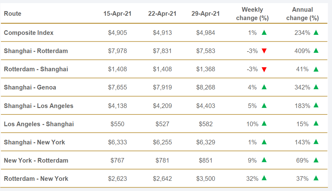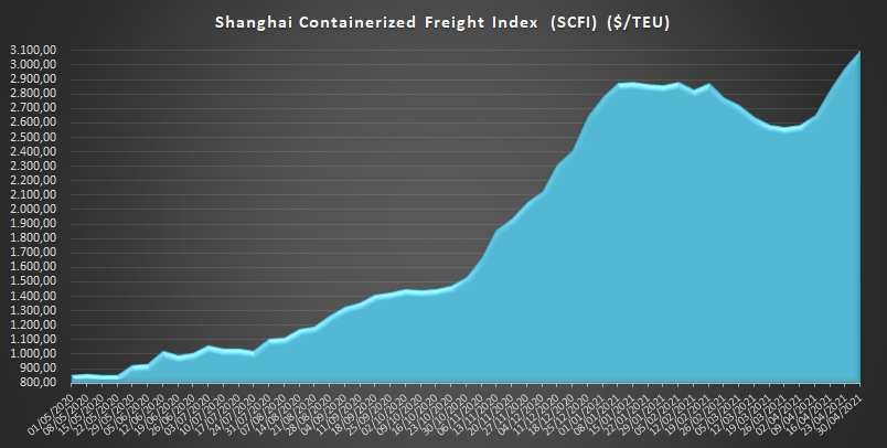 Esta semana los fletes desde Shanghái marcan un aumento del 4,1% respecto a la semana anterior y un incremento del 264% respecto al mismo periodo de 2020, lo que coloca al índice en 3.100,74 $/TEU.