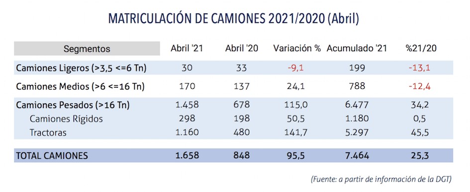 En cuanto a los vehículos pesados de más de 16 toneladas, las matriculaciones se encuentran un 115% por encima de las del cuarto mes de 2020, con 1.458 unidades.