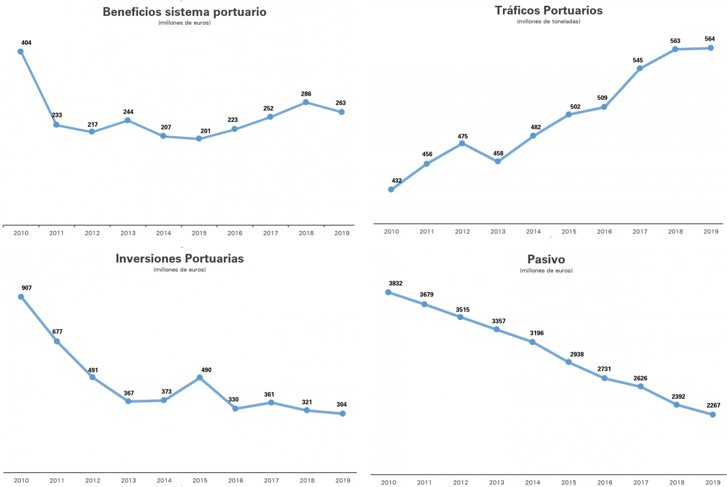El colofón de este marco general es que entre 2010 y 2019 los puertos españoles han acumulado unos beneficios de 2.530 millones de euros, permaneciendo el beneficio anual de forma invariable por encima de los 200 millones de euros en los últimos 9 años.