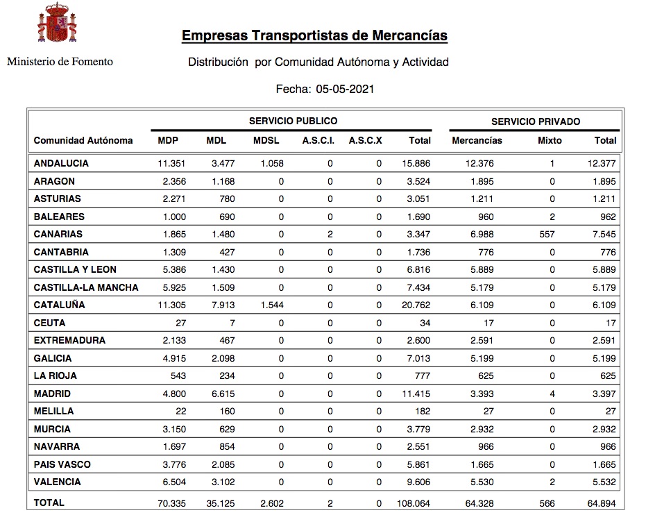 De acuerdo con los últimos datos publicados por el Ministerio de Fomento, en mayo de 2021 se han registrado 108.064 empresas públicas de transporte de mercancías, un 4,17% anual más, cuando eran 103.736. De ellas, un total de 70.335 emplean vehículos pesados y 35.125 empresas públicas realizan su servicio con vehículos ligeros.