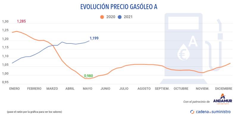 Entre los días 4 y el 10 de mayo de 2021, el precio del gasóleo ha alcanzado su máximo anual, al situarse en los 1,199 euros por litro, lo que supone un incremento del 0,92% respecto a los 1,188 euros de la semana anterior, según los datos proporcionados semanalmente por el Boletín Petrolero de la Unión Europea.