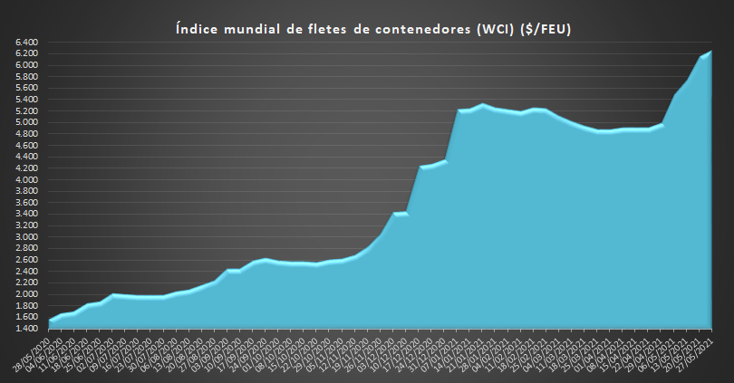 El índice compuesto promedio del WCI, evaluado por Drewry para el año hasta la fecha, es de 5.243 dólares por contenedor de 40 pies, 3.348 dólares más alto que el promedio de los últimos cinco años, situado en 1.895 dólares por contenedor de 40 pies.