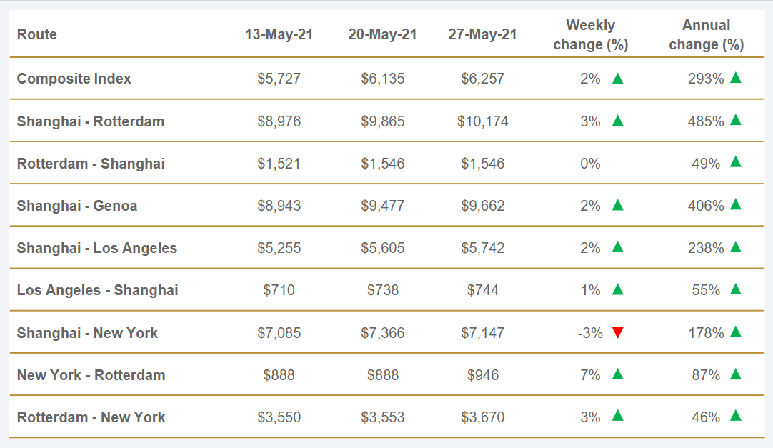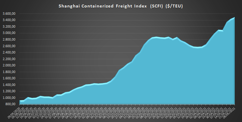 Los fletes desde Shanghái marcan un aumento del 1,8% respecto a la semana anterior y un incremento del 280% respecto al mismo periodo de 2020, lo que coloca al índice en 3.495,76 $/TEU.