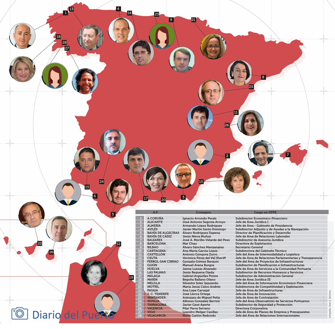 Del resto de máximos responsables en el organigrama de OPPE hay que destacar que José Antonio Morillo-Velarde del Peso, subdirector de Asesoría Jurídica, queda como consejero de Baleares; Gabriel Argüelles Pintos, subdirector de Administración General, como consejero de Málaga; Manuel Arana Burgos, subdirector de Planificación e Infraestructuras, como consejero de Gijón; Javier Martín Santo Domingo, subdirector Adjunto y de Ayudas a la Navegación, como consejero de Avilés; María Jesús Calvo, subdirectora de Competitividad y Explotación, como consejera de Motril; y Javier Gesé, subdirector de Seguridad y Protección, como consejero de Tarragona.