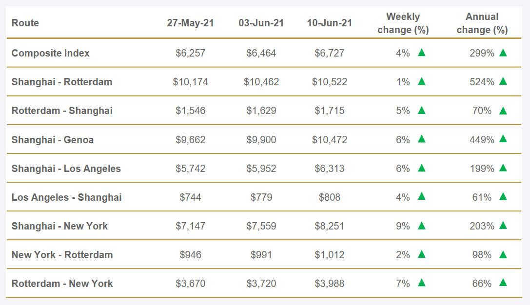 Los fletes desde Shanghái marcan hoy un aumento del 2,5% respecto a la semana anterior y un incremento del 265% respecto al mismo periodo de 2020, lo que coloca al índice en 3.703,93 $/TEU.