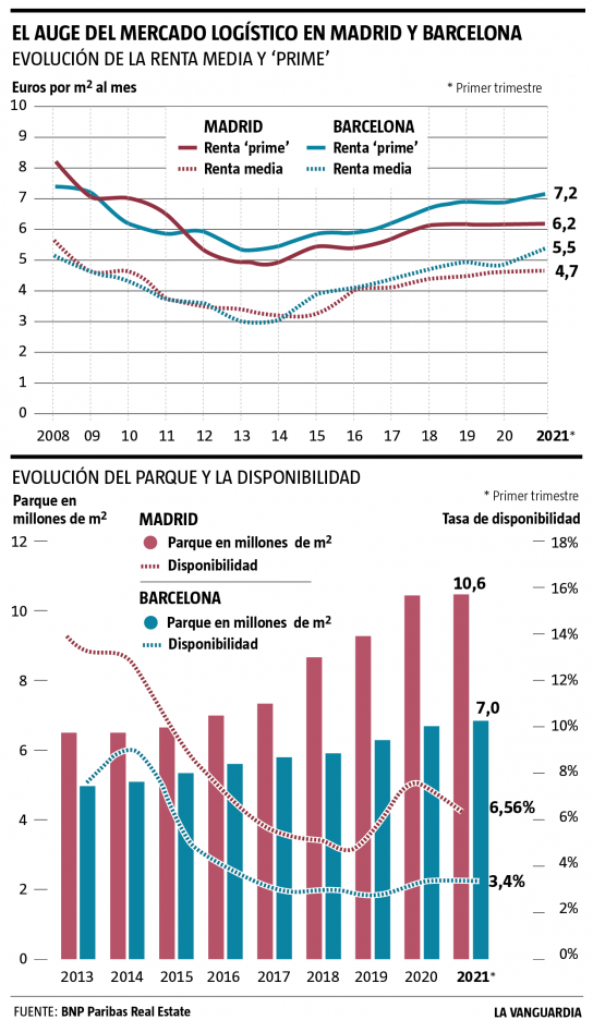 Pero el auge del comercio electrónico ha disparado la contratación de naves logísticas hasta niveles récord. Según CBRE, en Madrid la contratación en el primer trimestre alcanzó los 345.089 m², lo que supone un 167% más que en el mismo periodo del 2020 y un 22% más que en el último trimestre de ese año. En Barcelona, la contratación ha alcanzado los 253.000 m², lo que supone un 133% más que en el mismo periodo del 2020.