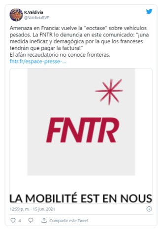 ara la FNTR, las regiones no podrán invertir lo recaudado en sus infraestructuras porque «se asignará necesariamente al presupuesto general». Además, añade que «debilitará financieramente a las empresas de transporte y a sus clientes, a quienes los transportistas tendrán que repercutir necesariamente el coste». El director general de Astic, Ramón Valdivia, ha mostrado su solidaridad con la patronal francesa. «El afán recaudatorio no conoce fronteras», ha tuiteado Valdivia.