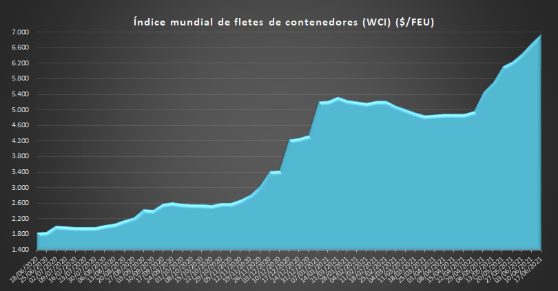 Por su parte, el World Container Index (WCI), que evalúa el coste de los fletes en la principales rutas hacia y desde Estados Unidos, se sitúa en 6.957,44 dólares por contenedor de 40 pies, lo que supone un incremento del 3,4% con respecto a la semana anterior y una subida del 273% en comparación con el mismo período de 2020.