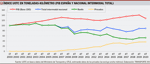 El tráfico intermodal nacional no logra poner freno a la brecha que se ha ido generando desde principios de siglo, tanto en volúmenes medidos en toneladas-kilómetro como en relación con la evolución del Producto Interior Bruto (PIB) en estas dos últimas décadas.