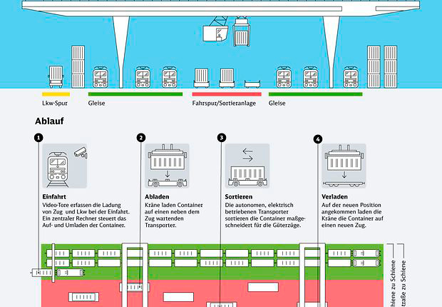 El Gobierno alemán, en colaboración con los Ferrocarriles Alemanes, DB, ha creado en el gran nodo de mercancías, Mega Hub Lehrte, una nueva terminal que ahorra hasta 250.000 viajes en camión anuales y evita la emisión de 120.000 toneladas de dióxido de carbono anuales.