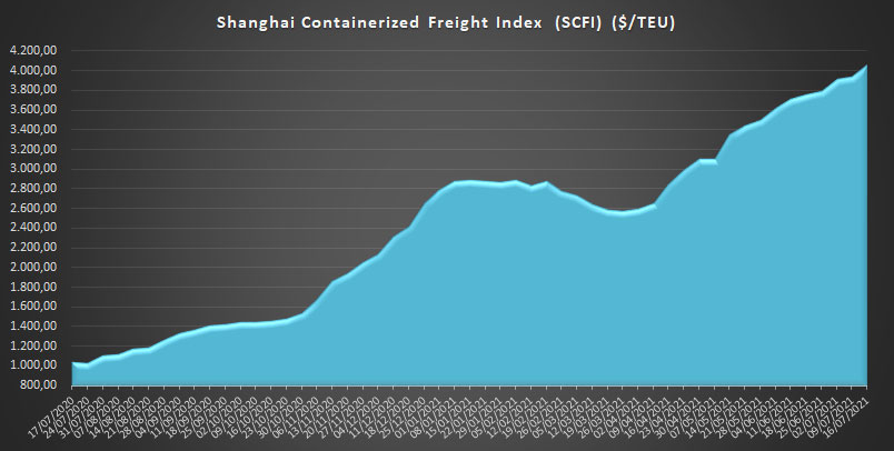 Los fletes desde Shanghái marcan hoy un aumento del 3,1% respecto a la semana anterior y un incremento del 292% respecto al mismo periodo de 2020, lo que coloca al índice en 4.054,42 $/TEU.