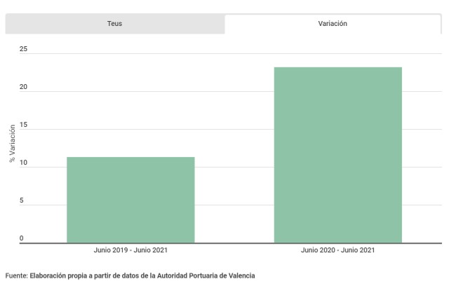 La actividad en los puertos gestionados por la Autoridad Portuaria de Valencia (APV), Valencia, Sagunto y Gandía, ha crecido en el mes de junio de 2021 por encima del 11% con respecto a las cifras registradas en el mismo periodo de 2019, último ejercicio que no estuvo afectado por la pandemia del Covid-19. Así, el tráfico total de mercancías ha superado en el sexto mes del año los 7,3 millones de toneladas, el 11,1% más que en el mismo mes de 2019 y el 20,6% respecto a junio de 2020. En el caso de los contenedores, en junio de 2021 se han alcanzado los 487.803 teus, lo que supone un incremento del 11,3% respecto al mismo mes de 2019 y del 23,2% en comparación con junio del año pasado.