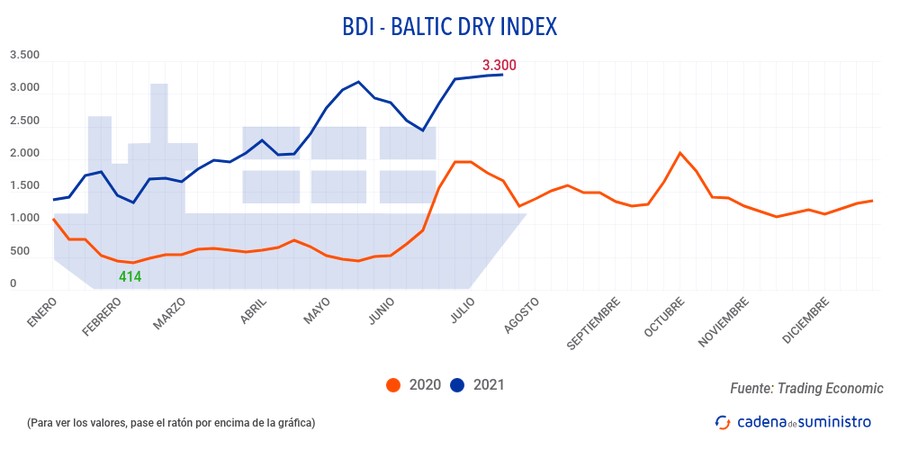 El Baltic Dry Index, BDI, que refleja los precios de los fletes de los buques graneleros tomando como referencia un total de 23 rutas marítimas, se ha situado el viernes 16 de julio de 2021 en los 3.039 puntos. Esto supone una caída de 34 puntos o del 1,1% durante la última jornada y del 7,9% a nivel semanal.