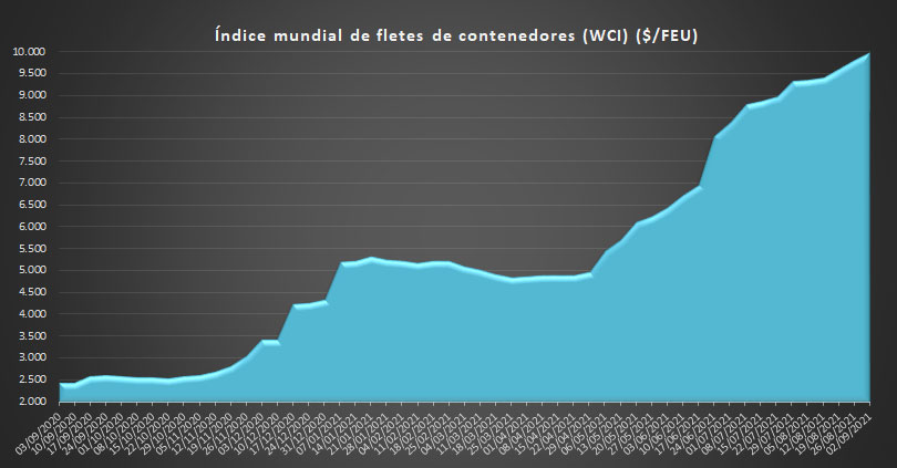 El índice compuesto promedio del WCI, evaluado por Drewry para el año hasta la fecha, es de 6.598 dólares por contenedor de 40 pies, 4.304 dólares más alto que el promedio de los últimos cinco años, situado en 2.294 dólares por contenedor de 40 pies.