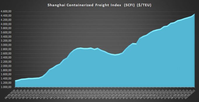 Los fletes desde Shanghái marcan hoy un aumento del 2,67% respecto a la semana anterior y un incremento del 241% respecto al mismo periodo de 2020, lo que coloca al índice en 4.502,65 $/TEU.