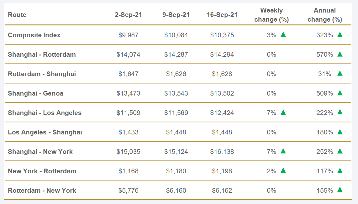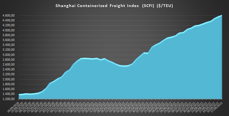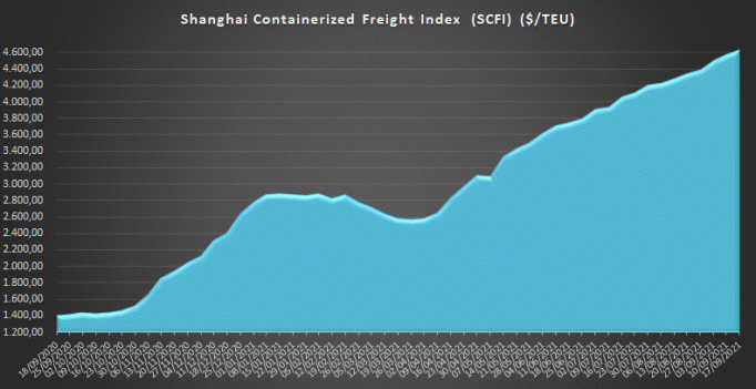 Los fletes desde Shanghái marcan hoy un aumento del 1,19 % respecto a la semana anterior y un incremento del 228 % respecto al mismo periodo de 2020, lo que coloca al índice en 4.622,51 $/TEU.