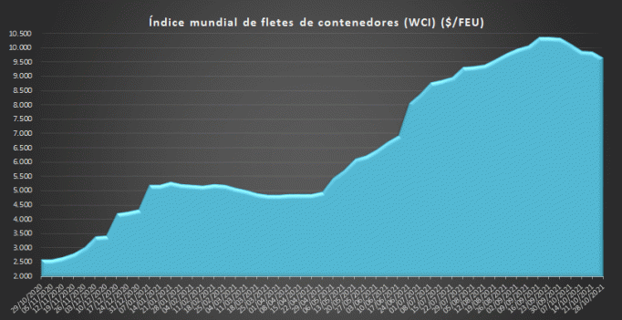 29/10/2021 ACE Con un valor de 4.567,28 $/TEU, los fletes desde Shanghái marcan hoy un descenso del 0,4% respecto a la semana anterior, aunque mantienen un incremento del 199 %…