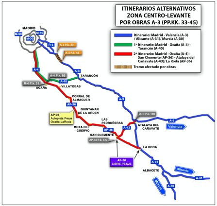 De momento, desde este lunes 27 de septiembre y hasta el 8 de octubre, estará cortado el tramo en la A3 entre los puntos kilométricos 35 y 37,4 por rehabilitación del firme. El corte se prolongará las 24 horas y la DGT propone itinerarios alternativos para los vehículos que vayan con destino a poblaciones de la zona de obras o a Valencia, Castellón… Las obras se prolongarán varios meses en diferentes tramos de la Autovía A3, de los que os iremos informando.