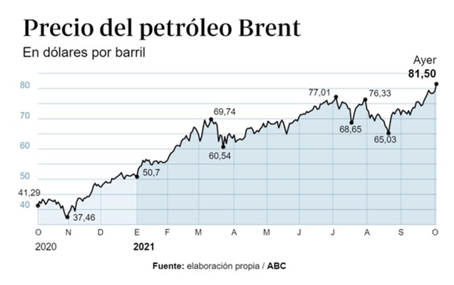 La cotización del petróleo registró ayer una importante subida que, en el caso del tipo Brent, llegó a rozar los 82 dólares el barril, su nivel más caro desde octubre de 2018.