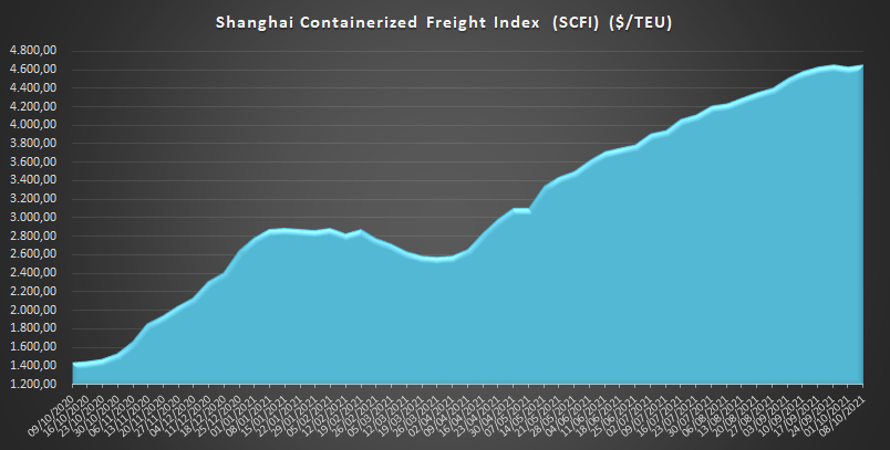 Con un valor de 4.647,60 $/TEU, los fletes desde Shanghái marcan hoy una subida del 0,7 % respecto a la semana anterior, lo que se traduce en un incremento del 223 % respecto al mismo periodo de 2020.