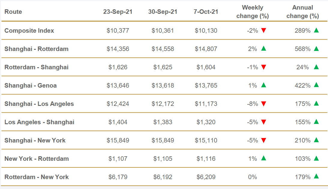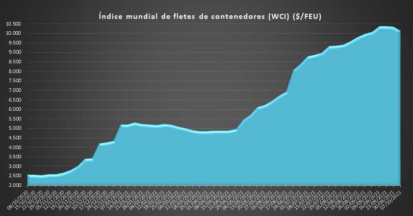 El índice compuesto promedio del WCI, evaluado por Drewry para el año hasta la fecha, es de 7.056 dólares por contenedor de 40 pies, 4.593 dólares más alto que el promedio de los últimos cinco años, situado en 2.464 dólares por contenedor de 40 pies.