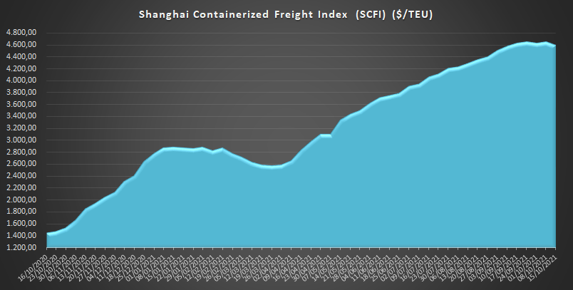 Con un valor de 4.588,07 $/TEU, los fletes desde Shanghái marcan hoy un descenso del 1,3% respecto a la semana anterior, pero mantienen un incremento del 217 % respecto al mismo periodo de 2020.