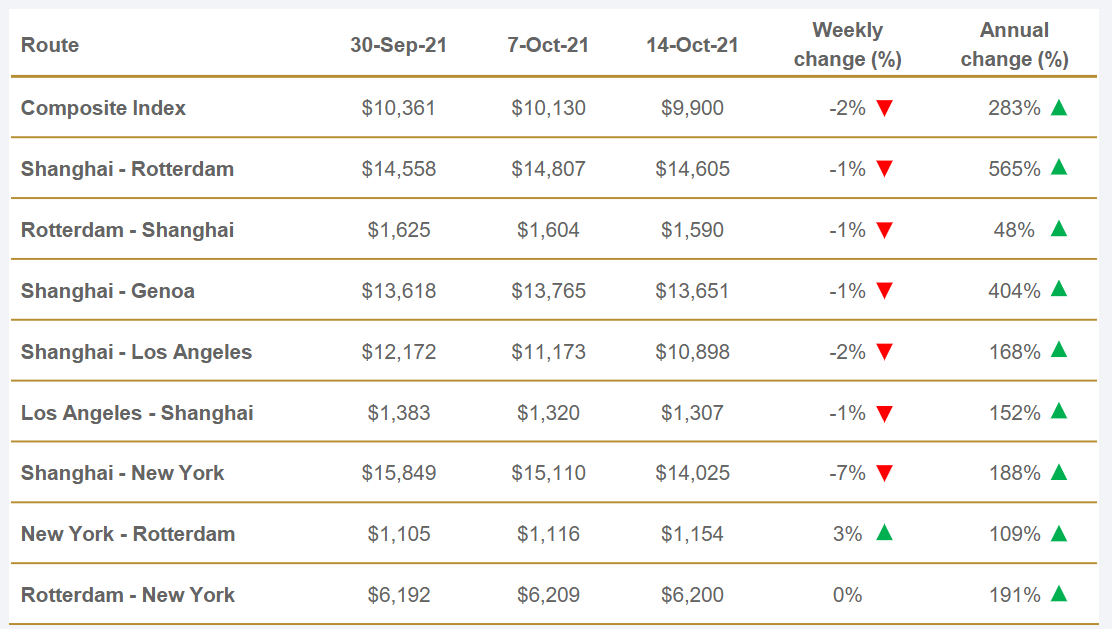 Por su parte, el World Container Index (WCI), que evalúa el coste de los fletes en la principales rutas hacia y desde Estados Unidos, se sitúa en 9.900,25 dólares por contenedor de 40 pies, lo que supone un 2,3 % menos que la semana anterior pero una subida del 283% en comparación con el mismo período de 2020.