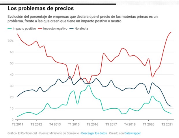 Nunca antes, en los 10 años de historia de esta encuesta, se había registrado tal porcentaje de empresas sufriendo problemas por la evolución de los precios. Y eso que se trata de los datos de la encuesta correspondiente al tercer trimestre del año, esto es, entrevistas que se realizaron a finales de agosto y durante el mes de septiembre. En las tres últimas semanas, las tensiones de precios incluso se han incrementado, por lo que es posible que los datos sigan empeorando.