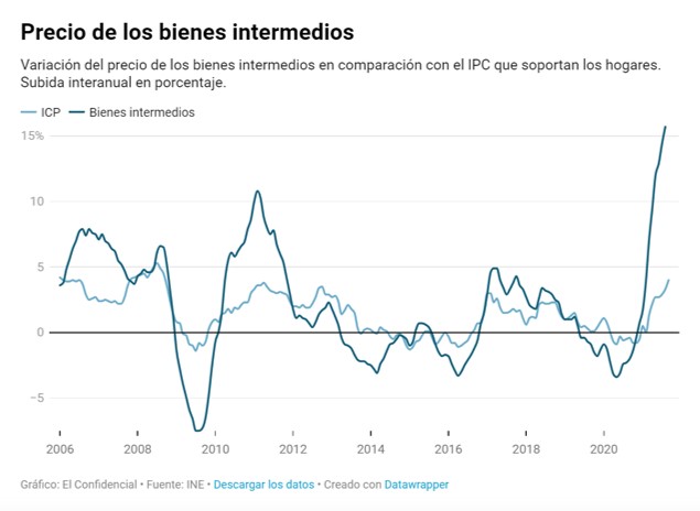 En el último año, el precio de los bienes intermedios de la industria se ha disparado un 16%, con datos hasta agosto, según los datos del INE. Se trata de una cifra nunca vista que duplica los registros de los años de la burbuja inmobiliaria. De hecho, la subida de los bienes intermedios multiplica por cuatro la inflación del IPC general y por 16 la del IPC sin energía. Esto es, las empresas están sufriendo una inflación muy superior a la de los hogares.