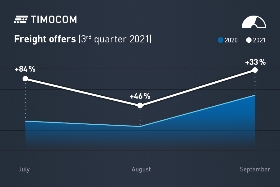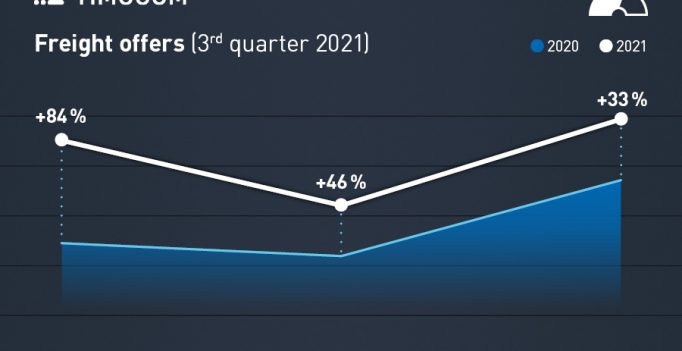 El tercer trimestre de 2021 confirma de nuevo la tendencia alcista del transporte de mercancías por carretera. El barómetro de transporte de TIMOCOM registra una nueva subida de las cargas. Los datos acumulados de 46 países europeos señalan un aumento del 51 % frente al tercer trimestre de 2020.
